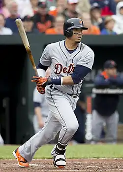 April 23, 2014, Martínez singled in the ninth inning of a game against the Chicago White Sox for his 1,500th career hit.[15] On July 6, Martínez was selected in the player voting to participate in his fifth AL All-Star game, and his first as a Tiger.[16] Martínez did not participate in the All-Star game due to side soreness, and was replaced by teammate Ian Kinsler.[17] In a game against the New York Yankees on August 27, Martínez hit his 26th home run of the 2014 season, establishing a new career high. His previous high mark was 25 home runs for the Cleveland Indians in 2007.[18]