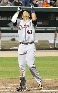 On November 23, 2010, Martínez and the Tigers organization reached an agreement on a four-year, $50 million free agent contract.[9] On March 31, 2011, Martínez made his debut for the Tigers as a designated hitter against the New York Yankees.[10] Martínez was used almost exclusively as a designated hitter for the 2011 season, playing only 26 games at catcher and 6 games at first base. He had a slow start to the season, batting .250 in the month of April with two home runs, but he then batted .337 in May and .370 in June. On September 11, in a game at home against the Twins, he had perhaps his worst-ever game at the plate, going 0 for 4 and hitting into four double plays (three of them GIDPs, one a line drive); his team managed to win anyway, 2–1. It was the first time a batter had hit into four double plays in the American League since hall of famer Goose Goslin did so in 1934, also while playing for the Tigers, and also in a game the Tigers won, 4–1. Although his power numbers were down, with only 12 home runs all season, Martínez posted his best career batting average (.330, good for fourth best in the American League), tied his career high with 40 doubles, and had his fourth career 100+ RBI season (103). He also led the Major Leagues in batting average with runners in scoring position, hitting .394.
