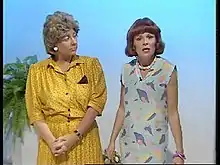 Julie Walters was a long-term collaborator of Wood's, although unlike Wood and Walters, their previous television series together, only Wood's name remained in the title. This was because in the interim, Wood was getting viewers of it turning up to her solo stand-up shows expecting to see a double act.[24] This did not stop Wood making Walters almost as prominent in this newer series. She played many two handers with Wood as well as other roles such as daytime television host Margery, a mad shoe shop lady, the elderly waitress in the Two Soups sketch, and a transsexual hairdresser. Most famously, she played cleaning lady Mrs. Overall in Acorn Antiques. She later revealed that alongside her starring role in Educating Rita, it's the part she's still recognised the most by the public for.[25]