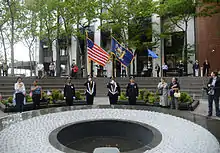 Mayor Rudy Giuliani rededicated the plaza on November 9, 2001, following the September 11, 2001, attacks, as it underwent a $7 million restoration.[5][13] A new ceremonial entrance was added providing access from Water Street to South Street and a black granite fountain placed at the center. The "Walk of Honor" contains 12 polished granite pylons with the names of all 1,741 people who died.[5]