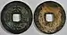 According to the Đại Nam Thực lục chính biên, there were several different types of Gia Long Thông Bảo cash coins cast.[48] A bronze cash coin with the inscription Thất phần (七分) in seal script on its reverse, a thicker zinc cash coin with the inscription Nhất phần on its reverse, and a copper-alloy cash coin with dots on its reverse side symbolising the sun and moon.[48] The 7 phần zinc cash coins started being made from the year Gia Long 12 (1813) onwards.[48]