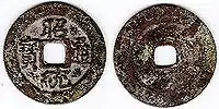 Generally cast coins produced by the Vietnamese from the reign of Lý Thái Tông and onwards were of diminutive quality compared to the Chinese variants.[21] They were often produced with inferior metallic compositions and made to be thinner and lighter than the Chinese wén due to a severe lack of copper that existed during the Lý dynasty.[22] This inspired Chinese traders to recast Chinese coins for export to Vietnam, which caused an abundance of coinage to circulate in the country, prompting the Lý government to suspend the mintage of coins for five decades.[22]