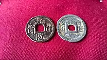 Under the Hồ dynasty cash coins with the inscriptions Thánh Nguyên Thông Bảo (聖元通寶) and Thiệu Nguyên Thông Bảo (紹元通寶) were introduced, but they would only be manufactured in small numbers, though the Later Lê dynasty would produce coins with the same inscriptions less than half a century later in larger quantities.[32][33]