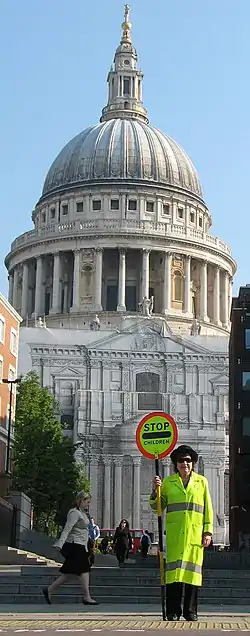 A London "lollipop lady" with St. Paul's Cathedral in the background.