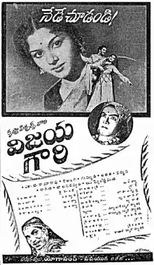 Vijaya Gauri is a 1955 Telugu-language swashbuckler film, produced by Krishna Pictures banner[1] and directed by D. Yoganand.[2] It stars N. T. Rama Rao, Padmini and music composed by G. Ramanathan and Viswanathan–Ramamoorthy.[3]