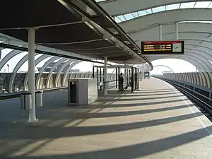Vijfsluizen is an above-ground of Rotterdam Metro line C. The station is located in the Vlaardingen area of the City of Schiedam, adjoining Rotterdam. It was designed by Zwarts & Jansma architects and entered service with the opening of the line on 4 November 2002. Vijfsluizen station is an important transfer point between the metro and buses.
