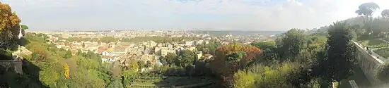 The view of the city was one of the most famous, and recorded by many artists. Giorgio Vasari made his Grand View of Rome from there, or very close by, though he slightly adjusted the slopes at the sides to expand what is actually visible from there, as did Giuseppe Vasi's Prospetto dell’alma città di Roma visto dal Monte Gianicolo, a famous large etching (1765) of the view. J. M. W. Turner did a drawing with watercolour in 1819.[7]