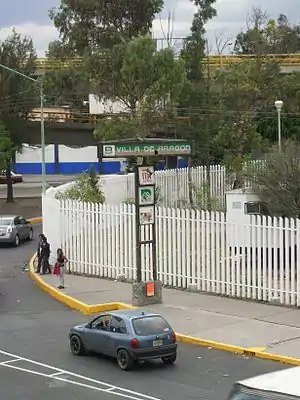 Villa de Aragón is a station on Line B of the Mexico City Metro system.[2][3] It is located in the Gustavo A. Madero municipality, in the limits with the State of Mexico. In 2019, the station had an average ridership of 14,456 passengers per day.[4]