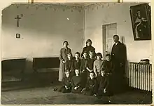 Gymnasium students wore a school uniform and a hat with gymnasium's initials.[25] The students were active and organized various music and theater performances, played sports, had a scouting group and a Catholic group Atžala.[11][25] On several occasions, students performed for official delegations visiting from Kraków, Lviv, Silesia to showcase the culture of Vilnius Region.[3] The school also emphasized religious education. Students participated in days-long Spiritual Exercises at the Church of Saint Nicholas and processions to Vilnius Calvary.[26]