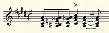 For example, Messiaen has written that "The 'Theme of Chords' is heard throughout, fragmented, concentrated, surrounded with resonances, combined with itself, modified in both rhythm and register, transformed, transmuted in all sorts of ways: it is a complex of sounds intended for perpetual variation, pre-existing in the abstract like a series, but quite concrete and quite easily recognizable through its colours: a steely grey-blue shot through with red and bright orange, a mauve violet spotted with leather-brown and encircled by bluish-purple."[3]