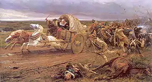 After occupying Varades, the Vendéen general staff decided to march on Laval, in the former lands of the Prince of Talmont. The latter was convinced that his influence would provoke an insurrection in the country. On 20 October, the Vendeans reached Candé, then Château-Gontier on the 21st, meeting little resistance. On 22 October, they seized Laval after a short battle. The generals then decided to give their men a few days' rest. However, on the same day, the Republican forces of the Army of the West crossed the Loire at Angers and Nantes, determined to pursue the "Brigands". Only Nicolas Haxo remained in the Vendée with his division, in order to fight Charette's troops. On 25 October, the Republican vanguard, 4,000 men strong, commanded by Westermann and Beaupuy, entered Château-Gontier. The republicans were exhausted, but Westermann refused to wait for the bulk of the army and, the very next day, he launched an attack on Laval. It was a rout for the Republican forces who lost 1,600 men at Croix-Bataille.[2]