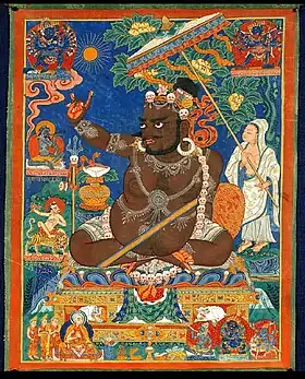 Tibetan sources further state that after years of tantric practice with no results, he gave up tantra and threw his mala in the toilet. Then he received a vision from the deity Nairatmya who became his main deity and he subsequently received teachings and empowerments from her.[8] He eventually left the monastery and traveled throughout India teaching tantra, performing various magical feats (siddhis) as well as "converting non-Buddhists (tirthikas), destroying their images and stopping their sanguinary rituals."[9]