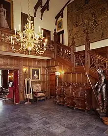 The rear hall again uses old oak high paneling and has small six by nine-inch oil portraits of Renaissance figures. Freestanding Corinthian columns in the hallway form an ornamental gateway and stained glass doors at the end enter the rear porch arcade. The dining room was furnished with oak bought later from Redbourn Manor in Hertfordshire and has an imposing Portland stone fireplace positioned midway in the room.[4] The floor is made of old re-sawn pegged oak and the Tudor rose ceiling motif is repeated.[4] In the southeast wing of the house is the Sulgrave Room, a reproduction of the great hall from the Washington family's Sulgrave Manor. The fireplace mantel is made of an oak beam, once used at the original priory.[4] Heavy oak timbers were used to construct the open beam ceiling in this room, which also features mottled plaster walls.[4]