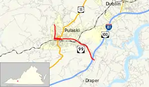 State Route 99 (SR 99) is a primary state highway in the U.S. state of Virginia. The state highway runs 5.20 miles (8.37 km) from the north town limit of Pulaski east to SR F-047 just east of Interstate 81 (I-81) and SR 100 at McAdam.