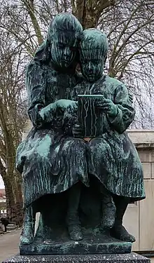• The funerary monument, a bronze statue by Ernest Bussière, represents two children reading, the elder guiding the younger.[3]