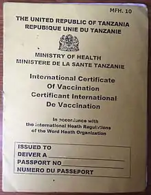 Proof of Yellow fever vaccination is required for all travellers travelling through or from the following countries: Angola, Argentina, Benin, Bolivia, Brazil, Burkina Faso, Burundi, Cameroon, Central African Republic, Chad, Colombia, Republic of the Congo, Democratic Republic of the Congo, Côte d'Ivoire, Ecuador, Equatorial Guinea, Ethiopia, French Guiana, Gabon, Gambia, Ghana, Guinea, Guinea-Bissau, Guyana, Kenya, Liberia, Mali, Mauritania, Niger, Nigeria, Panama, Paraguay, Peru, Rwanda, Senegal, Sierra Leone, South Sudan, Sudan, Suriname, Togo, Trinidad and Tobago, Uganda, Venezuela, Zambia.[16][17] The Tanzanian ministry of health mandates a transit time of more than 12 hours or a disembarkment from the immediate airport area from the above mentioned countries during transit as a possible health threat and requires travelers in such situations to possess Yellow Fever Certificates.[18]