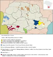 In the First Plateau of Paraná, or "Curitiba's Fields" as it is better known, it is traditional for the production of table wines, especially wines based on Terci (Bordeaux) grapes. These wines are commercialized in wineries located in good structures and well frequented, thanks to the existence of tourist routes, such as the Italian Rural Tourism Circuit (Circuito Italiano de Turismo Rural)[13] and the Wine Paths (Caminhos do Vinho),[14] in the cities of Colombo and São José dos Pinhais.[1] In Curitiba, in the neighborhood of Santa Felicidade, and in Campo Largo, some of the largest wineries in the country are concentrated. At the same latitude, west of Curitiba, the Campos Gerais municipalities stand out, such as Ponta Grossa, Palmeira, Antônio Olinto, Rebouças, and currently, Guarapuava. Besides these, the southwestern and western regions stand out, especially Toledo, and the Norte Pioneiro region. Further south, the grapevine cultivation occurs in mosaics in the cities of Rio Negro, Mallet, União da Vitória, Bituruna, and General Carneiro.[4]