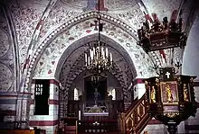 The oldest parts of the church are built in Romanesque style during the late 12th century or early 13th century. In the 15th century a chapel was built in the north. The chapel was dedicated to Saint Anne. The vaults were built in the 15th century with murals from the 1480s, showing stories from Genesis. These were later painted over, but again restored in the 20th century.