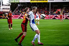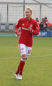 39 different clubs made inquiries about signing Miedema, before she signed a three-year contract with Bayern Munich in the top German league, the Frauen-Bundesliga in June 2014.[17] During the 2014–15 season, she was part of a Bayern team that remained unbeaten in the Bundesliga and won the title for the first time since 1976.[18][19] Miedema scored her first league goals in Germany on 5 October 2014 in a match against MSV Duisburg, leading to Bayern's 6–0 win.[20] In the match against SGS Essen on 30 November, Miedema tore the outer band of her ankle resulting in some time away from the pitch. She re-emerged in the German league on 22 February 2015 against VfL Wolfsburg, scoring again in the following match, against Bayer Leverkusen.[13][21] Miedema finished the season with 7 goals in 17 matches.[13] She helped Bayern Munich defend the title the following season with 14 goals in 22 matches.[13]