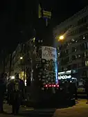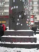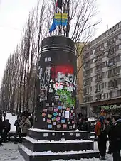 The statue was toppled from its pedestal and crushed by protesters on 8 December 2013, as part of the Euromaidan events, when many other Soviet statues were toppled. The plinth remains in place,[1] and has become at times a site of political artwork, and arguments.[2] Since 2016 various sculptures or installations have been exhibitioned in front of the plinth.[1]