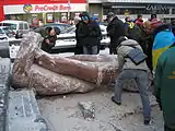 Later, on 8 December 2013, several Ukrainian individuals subsequently claimed to be affiliated with the Svoboda political party[5] toppled the statue, as Kyiv police silently looked on. The statue then broke from impact with the ground.[6]