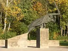The Gedenkstätte der 3000 Interbrigadisten, which is located on the Friedenstrasse, was built in 1968 and commemorates 3000 fighters who served in International Brigades during the Spanish Civil War. The six-meter-high bronze figure was designed by Fritz Cremer, with reliefs created by Siegfried Krepp.
