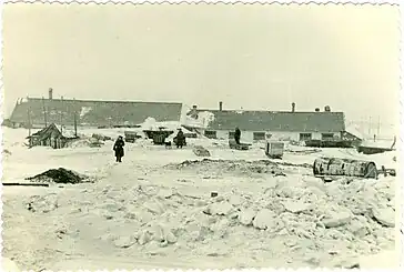 1941, this important event was attended by residents of Vorkuta and photographed by Fomin Yakov Yakovlevich who was in charge of constructing the railway. From 1939, Polish prisoners were held at Vorkuta following the Occupation of Poland[9] until the German invasion of the Soviet Union in 1941.[10] Vorkuta was then also used to hold German prisoners of war captured on the Eastern Front in World War II as well as criminals,[11] Soviet citizens and those from Soviet-allied countries deemed to be dissidents and enemies of the state during the Soviet era, US soldier were also held in the camp, a majority of whom were captured from the Korean War.[12] Many prisoners didn't survive in the camp and died by freezing to death in the cold climate, dying from starvation as food was scarce in Vorkuta, or the inmates worked themselves to death. Prisoners were given rye bread, buckwheat, a little meat and fish and potatoes as food but in very small amounts, Prisoners resorted to killing rats or stray dogs for food. Self-harm was common in the camp, if an inmate sustained an injury they would be sent to the hospital where conditions were better. The average amount of working time in the camp was 16 hours a day for every inmate.[13] The guards who protected and managed the Gulag were a part of the NKVD, MVD and the Red Army. Guards were most often recruited on three-year contracts after completing their basic military service. Regulations allowed guards to shoot without warning any prisoner who strayed outside the designated work zone or too near a camp fence.[14]