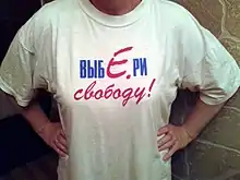 1. The shirt reads "Выбери свободу!", or "choose freedom!". The "Е" is capitalised as part of Yeltsin's surname in Cyrillic (Ельцин).