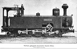 The DRG Class 99.17, formerly the Württemberg Ts 4 of the Royal Württemberg State Railways were German narrow gauge steam locomotives bought for working the 15.11 kilometre long route between the towns of Altensteig and Nagold. The three tank locomotives had an outer frame and a Klose drive. The first and third axles were steered by the third, radially-sliding axle by means of a system of levers. The second axle was driven by the inside cylinder and had no wheel flanges. Overall the system was very reliable, but nevertheless also very maintenance-intensive.