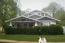 The W. C. Baker House is an airplane bungalow located at 301 E. Commerce in the city of Altus, Oklahoma. The house was built in 1917 for the sister of William Clarence Baker; however, Baker bought the house shortly afterward. Baker owned a local machine shop and cotton gin, and he served on Altus' original city council. The house has a typical airplane bungalow plan with a small second story above a low, multi-component first-floor roof, a design reminiscent of an airplane's cockpit. The house's design also includes many characteristic features of the Craftsman style, including overhanging eaves and exposed rafter tails. The porch features battered columns supporting its roof and decorative stickwork in its gable, both of which are typical Craftsman elements.[2]