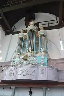 The Waalse kerk is a Walloon church that was built in the middle of the 14th century and has an upper gallery built for the Beguines who lived there on the courtyard that still bears their name.[1] The sacristy dates from the 16th century, with wooden arches and a mantel from the 17th century.[1] The organ was built in 1808 by Friederichs, and in the attic there is a mechanical clock that drives the hands on the clock of the organ.[1] In the church tower there is a bell from 1512 with a diameter of 56.5 centimeters.[1]