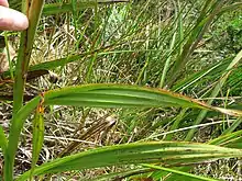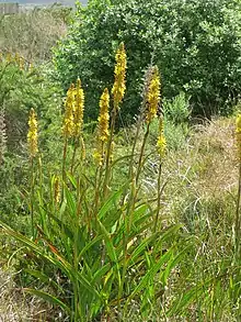 The marsh butterfly lily is a perennial herbaceous plant of 0.6–2.5 m (2.0–8.2 ft) high, that grows from an irregular, more or less cylindrical rootstock of up to 15 cm (5.9 in) long, sheathed by the overlapping bases of the leaves and that produce roots from the nodes. The leaves are up to 90 cm (35 in) long and 8 cm (3.1 in) wide, evergreen, upright, strap- to lance-shaped, deeply pleated, firm, hairless and mostly shorter than the flowering stem. Younger plants hay have leaves less than 5 cm (2.0 in) wide. The flowering stem may be up to 2.5 m (8.2 ft) long and up to 1.5 cm (0.59 in) at the base, robust, upright, with many soft hairs of up to 4 mm (0.16 in) long towards the base gradually transforming into glandular hairs of about 1 mm (0.039 in) long towards the top of the flowering branches. The inflorescence is a dense cylindrical panicle of up to 60 cm (24 in) long and 20 cm (7.9 in) wide. The inflorescence has many, up to 10 cm (3.9 in) long branches that are regularly spaced on the top half of the stem. In younger plants the inflorescence is often more open. Each branch seldom carries more than 7 flower buds and the branches themselves do not divide further. The persistent lance-shaped bracts are 1–4 cm (0.39–1.57 in) long, dry, brown and papery, and recurved at their tips. The zygomorphic perianth consists of six somewhat spade-shaped, golden yellow tepals of 12–28 mm (0.47–1.10 in) long and 8–14 mm (0.31–0.55 in) wide. The upper 3 tepals may be adorned near their base with light to dark markings that function as nectar guides. The central upper tepal is shorter and narrower than the others and has a slightly recurved tip. The upper five tepals are overlapping. The tepals may sometimes have a row of orange hairs of equal length and at regular intervals along the rim. The filaments are about one quarter of the length of the tepals at 15–20 mm (0.59–0.79 in) long and widely spreading. They are topped by anthers of 1.2–2.0 mm (0.047–0.079 in) long and 0.5–1.0 mm (0.020–0.039 in) wide. In the centre of each flower is a yellowish, superiorly positioned ovary of 2–3 mm (0.079–0.118 in) high and 1–2 mm (0.039–0.079 in) in diameter. On top of the ovary is a style of 13–18 mm (0.51–0.71 in) long, conspicuously angled to either the right or the left, opposite two of the stamens. The ovary develops into a capsule with three compartments of approximately 1 cm (0.39 in)high and 0.7–1 cm (0.28–0.39 in) in diameter. The seeds are densely hairy, up to 5 mm (0.20 in) long and kidney-shaped to oval. The base chromosome count is 15 (n=15).[3][4]