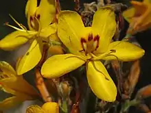 Wachendorfia thyrsiflora, the marsh butterfly lily,[1] is a plant species of 0.6–2.5 m (2.0–8.2 ft) high when flowering, that has been assigned to the bloodroot family.[2] It is a large to very large evergreen perennial plant with an underground rootstock with clusters of roots produced at the nodes. The rootstock has a distinctive red colour that results from so-called arylphenalenone pigments. The sturdy, entire and broadly sword-shaped leaves have laterally flattened and pleated leaf blades. The golden yellow flowers are set a dense cylindrical panicle on a tall firm stalk. Flowering occurs from spring until mid-summer.[1]