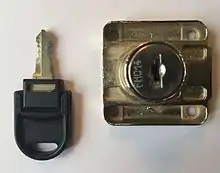 A common type of wafer tumbler lock, usually found on desk drawers, office cabinets, lockers and electrical panels