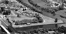 Ngāruawāhia in 1959, showing the Raglan County Council office, beside the Waipā bridge (top right)