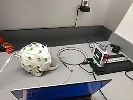 Electroencephalography cap.' A 64 channel EEG cap is shown here on a watermelon as a model. This type of cap is used to measure scalp electrical signal during many EEG studies of sleep.