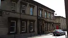 The Wakefield Borough Police came into being in September 1848 after the Borough Council were tasked with forming a 'constabulary force' for the newly formed borough.[1] The first police station was located in King Street and still stands today - the building immediately to the south was a Fire Engine House - the building originally being the 'Police and Vagrant Office' in 1829. The building consisted of two cells and a short time afterwards, a female detention was built on the first floor.[2] In 1876 the police station moved to half of a renovated building known as the 'Tammy Hall', which had been constructed in 1778 and when the southern half had been demolished to make way for the Town Hall, the northernmost part of the building was refurbished to form a new police and fire station. New buildings were added to the refurbished Tammy Hall, to the north (Chief Constable's Office and Charge Office); the west on King Street (Chief Constable's house) and the south (Fire Station). The ground floor housed 20 cells with an underground passage linking the cells in the police station to the cells below the Court Room in the Town Hall.[3] This building is now the Wakefield and Pontefract Magistrates' Court.