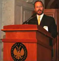 Prince Johannes zu Waldburg-Wolfegg speaks about his family's ownership of the Waldseemüller map in the Great Hall at the reception of the Thomas Jefferson Building for the opening of the Lewis and Clark exhibition.[3]