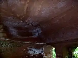 It has been estimated as dating from circa 1760 and has been hewn from soft red sandstone in the Gothic style as a man-made folly or grotto,[24] although the possibility remains that it was an extension of a natural cave.[25] The RCAHMS Canmore site classifies the site as post-medieval and holds no details of the grotto.[26] The original Auchinleck Castle stands upstream of the cave just above the confluence of the Dippol Burn with the River Lugar.
