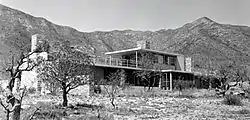 The Wallace E. Pratt House, also known as Ship on the Desert (sometimes hyphenated), was the residence of Wallace Pratt in what is now Guadalupe Mountains National Park in far western Texas. Pratt, a petroleum geologist for the Humble Oil & Refining Company, had previously built the Wallace Pratt Lodge in McKittrick Canyon a couple of miles to the north in the Guadalupe Mountains. Finding the cabin site to be remote and prone to being cut off by flooding, Pratt started construction of a new, modern residence on the east slope of the mountains. Work on the residence started in 1941. The house was designed by Long Island architect Newton Bevin, who lived for a time at the site with his wife, and built by contractor Ed Birdsall. Work was stopped by World War II, but resumed in 1945 and was completed the same year. In contrast to Pratt's rustic canyon cabin, the house, which Pratt named the Ship On The Desert, is an International Style house with horizontal lines and extensive glazing.[3] Only 16 feet (4.9 m) wide and 110 feet (34 m) long, the house provides broad views to the east over the plains and the west to the mountains. The majority of the house is on a single level, with a "captain's bridge" over the dining room giving access to a rooftop terrace. A detached garage contained a guest bedroom. Apart from glass, the predominant material was local limestone in several shades.[4]