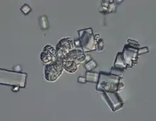| Micrograph showing characteristic sarcina-like morphology of W. ichthyophaga and crystals of NaCl. | |