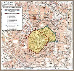 The construction of the medieval defensive structure of Milan started in 1156. In the beginning, a deep moat was realized, filled up with water drawn from the Seveso and Nirone rivers. Wooden walls were added as a supplementary defensive measure, and the remnants of the Roman walls were probably exploited as well. Despite this first defensive installment, Frederick I Barbarossa razed Milan to the ground in 1162. After that, reconstruction immediately started, this time with stone walls. The final wall system was almost circular (in poet Bonvesin de la Riva's words: "of admirable roundness"),[2] with seven main gates (Porta Ticinese, Porta Vercellina, Porta Giovia, Porta Comasina, Porta Romana, Porta Nuova and Porta Orientale) and about ten "pusterle" or posterns (including Pusterla dei Fabbri, Pusterla di Sant'Ambrogio, Pusterla delle Azze, Pusterla di San Marco, Pusterla Monforte, Pusterla Tosa, Pusterla di Sant'Eufemia, Pusterla della Chiusa).