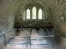 View of the Chapter House of Inchmahome Priory; effigies on the right represent the Countess Mary and Walter, Earl of Menteith.
