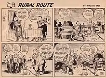 Early in his tenure at the Star, Ball (not yet a cartoonist) befriended legendary Canadian artist Jimmy Frise, who accepted a more lucrative offer from the Montreal Standard in the late 1940s. When the Star Weekly made a format change from broadsheet to tabloid in 1956, an editor asked Ball if he knew a cartoonist interested in creating a comic feature for the new publication. Ball suggested some names, but having always had a desire to enter the field, worked concurrently on his own strip. It was quickly accepted and one month into the new format, a reader survey indicated Rural Route had become the most read feature in the publication. It was syndicated by Miller Services to other local Canadian newspapers,[2] and it also appeared in several newspapers in the Midwestern United States.[3]