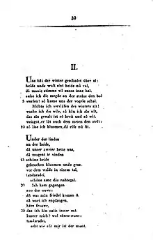 Consistent reference to Walther's songs is made by means of "Lachmann numbers", which are formed of an "L" (for "Lachmann") followed by the page and line number in Lachmann's edition of 1827.[39] Thus "Under der linden", which starts on line 11 on page 39 of that edition (shown in the page image, right) is referred to as L39,11, and the second line of the first strophe is L39,12, etc.[40] All serious editions and translations of Walther's songs either give the Lachmann numbers alongside the text or provide a concordance of Lachmann numbers for the poems in the edition or translation.