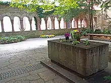 Grave of Walther von der Vogelweide in the Lusamgärtchen, Würzburg, Germany. This 1930 tombstone replaced an earlier one removed in the 18th century.