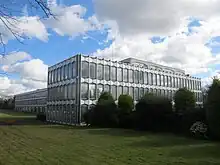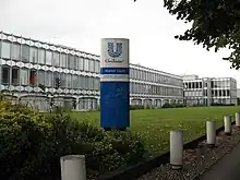 The main building was a long three-storey rectangular structure with a flat roof, about 318 ft × 170 ft (97 m × 52 m), around two internal courtyards, set back from Station Avenue to the north behind with a reflective pool and lawns. The 1967-68 extension was added across the west end, joined by a glazed link, to create a T layout. It was constructed with a precast concrete and pre-stressed concrete frame, supporting high alumina cement beams with concrete slab floors, spanning large internal spaces without internal columns.