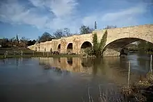 The Parish Church of St Mary the Virgin is a Grade I listed building and is the main Church of England parish church of Wansford.[2] There is also a former chapel in the village centre, but this has since been converted into a private residence. The Great North Road crossed the River Nene on Wansford Old Bridge, which is a Grade I listed building. The stone bridge replaced a wooden bridge with eight arches damaged by floods in 1571.[3] The Great North Road was diverted to the east and the 1920s concrete bridge is itself Grade II*; it now carries the northbound carriageway of the A1.