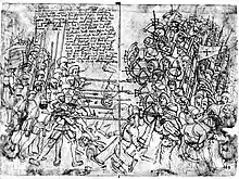 German mercenary engineer Paul Dolnstein's drawing of a Swedish peasant host fighting German mercenaries in 1501