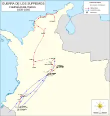The War of the Supremes (Spanish: Guerra de los Supremos, also called the Guerra de los Conventos, 'war of the convents') was a civil conflict in Republic of the New Granada (present-day Colombia) from 1839 to 1842 caused by the ambitions of various regional leaders (gamonales) to seize power and depose President José Ignacio de Márquez. It was called the War of the Supremes because of the participation of General José María Obando and other revolutionary gamonales who called themselves jefes supremos ('supreme chiefs').